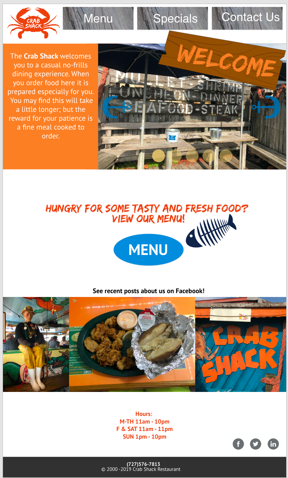 The Crab Shack is a local seafood restaurant located in St. Petersburg Florida. Going to the restaurant in person, it has a rustic and kitschy look and feel to it with seafood oriented decorations on the outside and inside of the shack. They are also located next to the bay where they catch all their seafood fresh to be served to their customers.